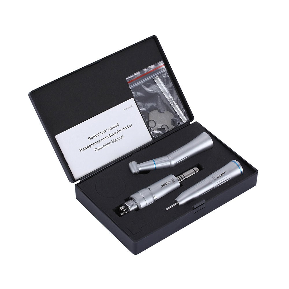 1:1 Slow Speed Handpiece & Air Motor Set With Internal Water Spray. Slow Speed HandpieceKit. Includes: E-type 4 Hole Air Motor, 1:1 Straight Nosecone Handpiece, and 1:1 Contra Angle With Push Button. Autoclavable to 135 ℃. Sturdy and Durable.