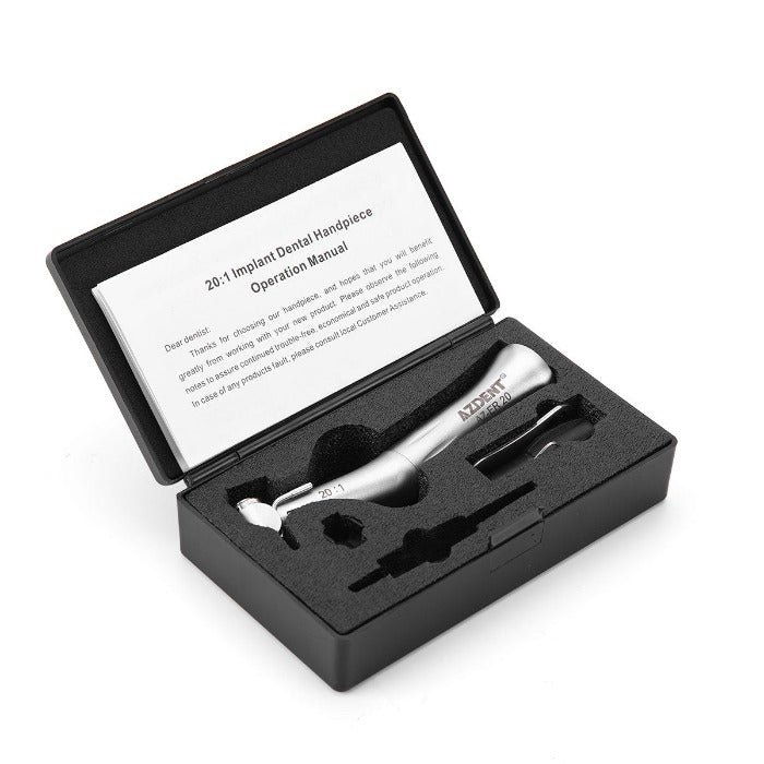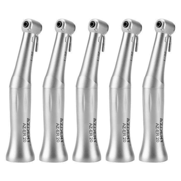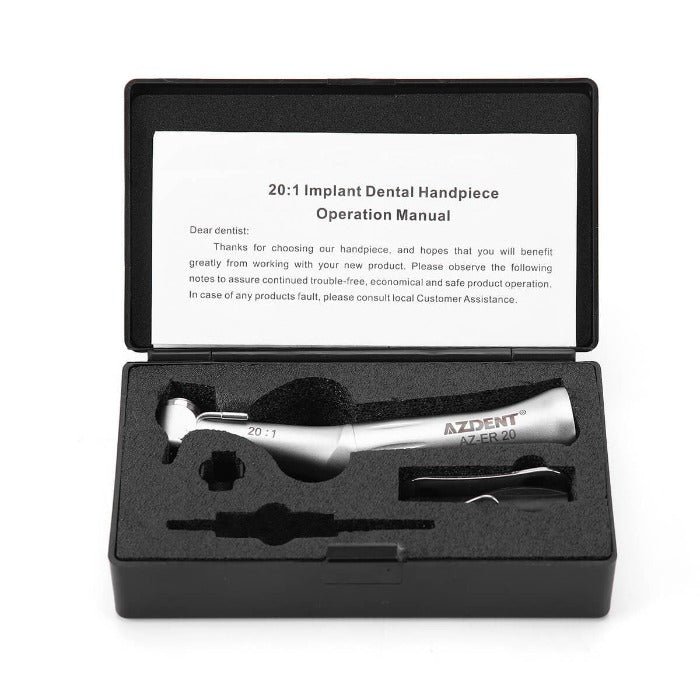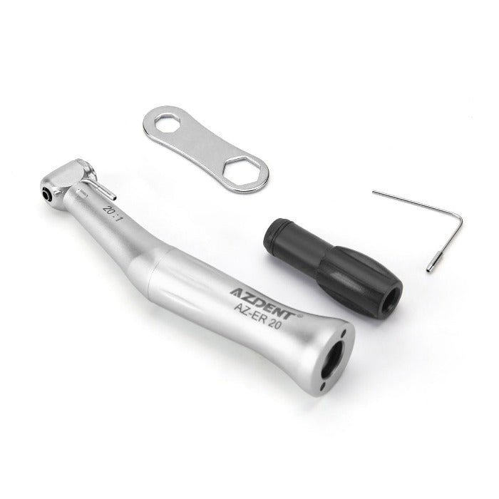 20:1 Implant Contra Angle Handpiece External Spray Push Button. Ergonomic Comfort Grip Chuck. Provides Sufficient Force at Low Speed. Available for Various E-type Motors.