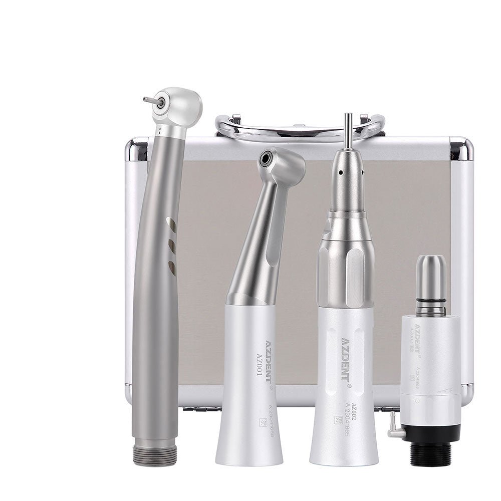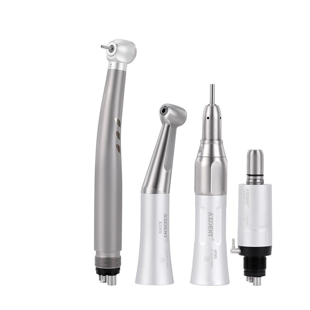 Dental High and Low Speed Handpiece Kit Stainless Body Shadowless LED E-generator 2/4 Holes. Low speed kit is E-type connector, push button type and external water spray. Its shorter, lighter air motor gives optimal balance, reducing stress and fatigue during treatments. High speed handpiece is standard push button type, single-way water spray, Stainless body and ring LED lamp, shadowless lighting.